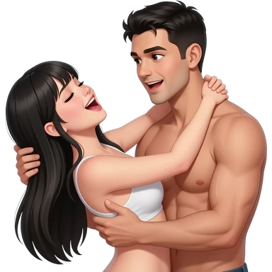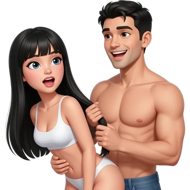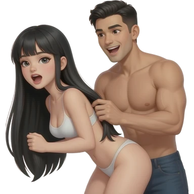 skinny white girl with long straight black hair nude in doggy style, slightly tanned slim guy short black hair average build grabbing her hair from behind explicit penetration, he looks excited, she moans in pleasure, both naked, realistic emoji