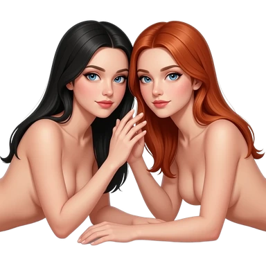 skinny young white woman with long straight black hair, fully nude, lying with another skinny young white woman with long straight red hair, both completely naked, gently caressing and touching each other, intimate lesbian scene, realistic emoji
