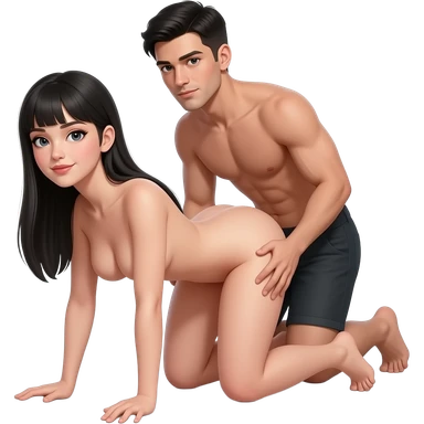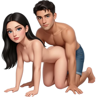 skinny young white woman with long straight black hair, fully nude, on all fours in doggy style, explicit penetration from behind by slim young man with lightly tanned skin, short straight black hair, average body, both naked, realistic, high resolution emoji