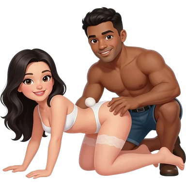 skinny young white woman with long straight black hair, fully nude, doggy style sex with young mulatto man with short black hair, both naked, explicit penetration, realistic emoji