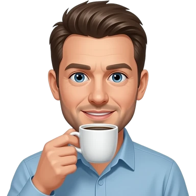 WHITE MAN IN HIS 50S with no facial hair WEARING A BLUE BUTTON UP HOLDING A CUP OF COFFEE emoji