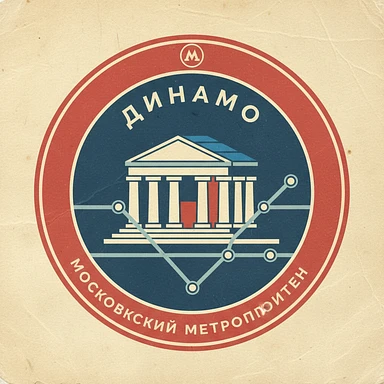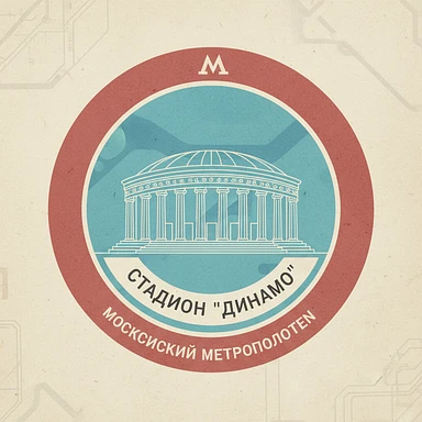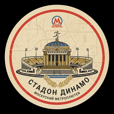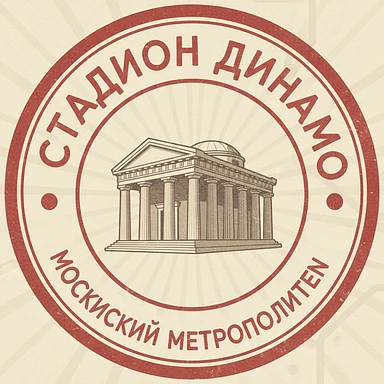 Нужно сделать круглую ретро-марку. Ее границы - не очень яркий красный круг, как у станции метро Москвы на ее схеме. Сама марка должна напоминать как будто станцию метро на схеме метрополитена На марке - стадион "Динамо" в виде древнего святилища emoji