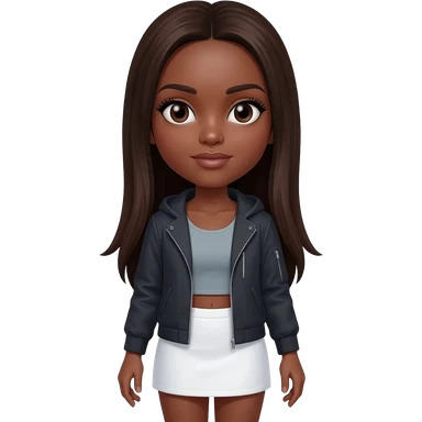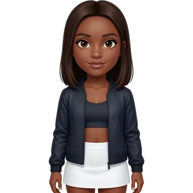 A girl with brown olive skin very very dark brown hair pretty dark brown eyes with long natural eyelashes wearing a lulu lemon tang top and jacket allong with a white mini skirt straight medium length hair emoji