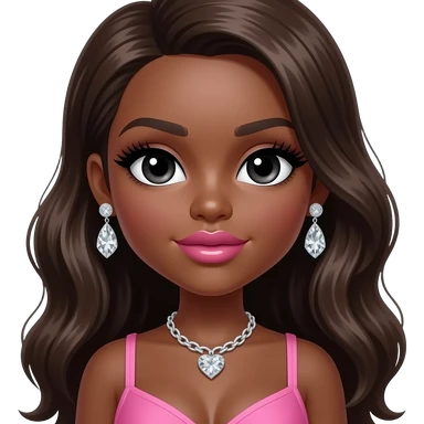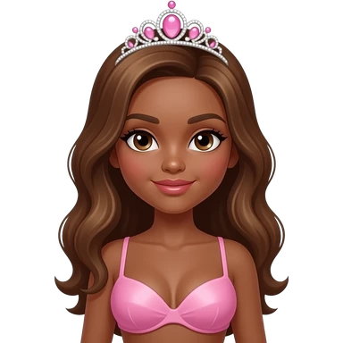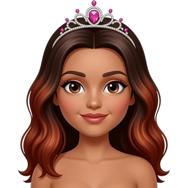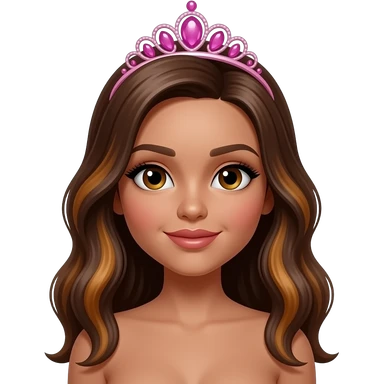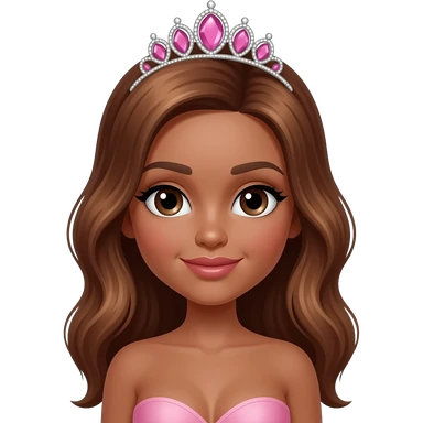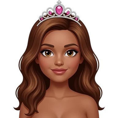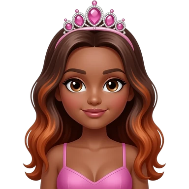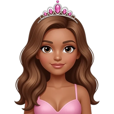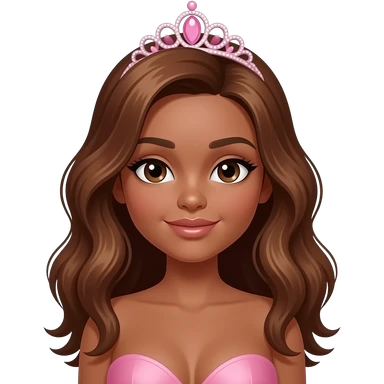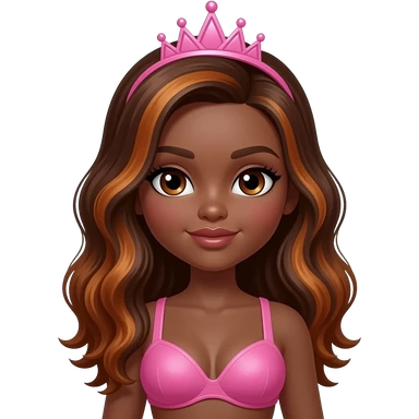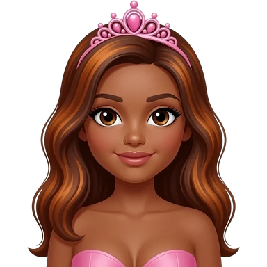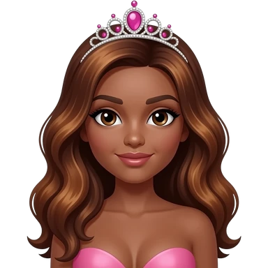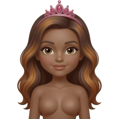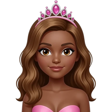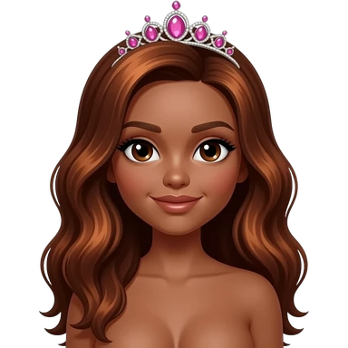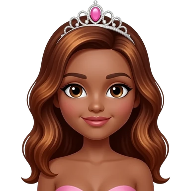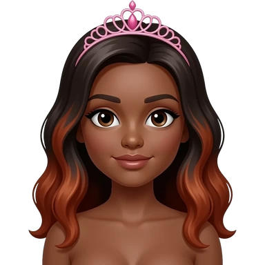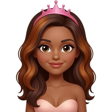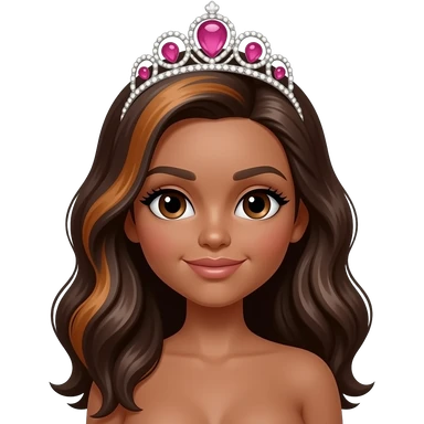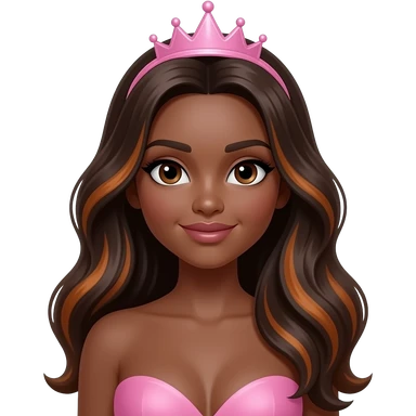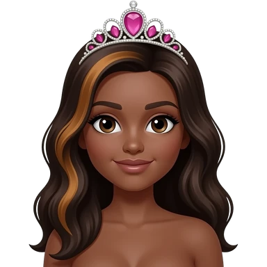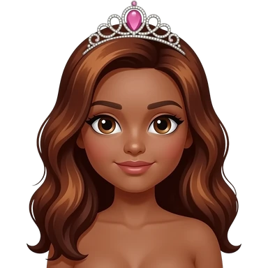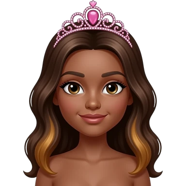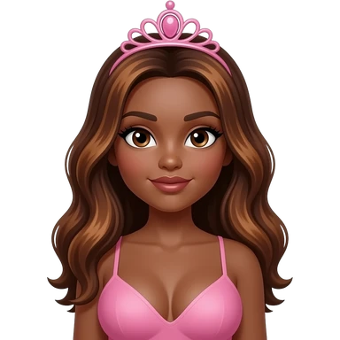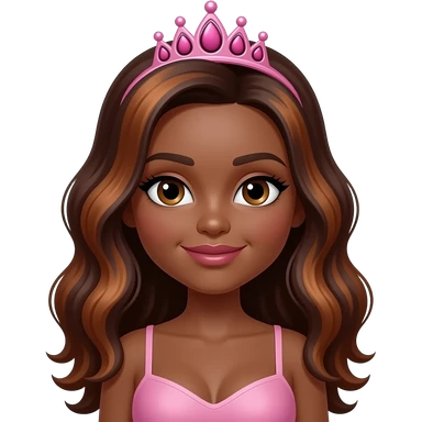 pink tiara, Dark brown eyebrows,Dark brown skin, Doll shaped face, doll eyes, wavy with side part longer straightened dark brown hair with auburn highlights, big breast no bra emoji
