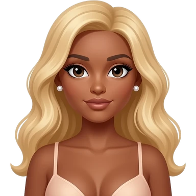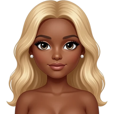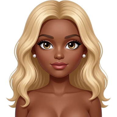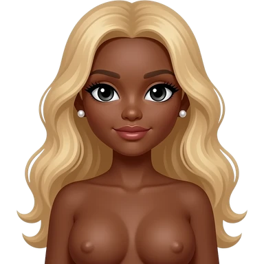 Dark brown skin, long blonde wavy hair, pearl earrings studs, long lashes, doll eyes, big breast, no bra emoji