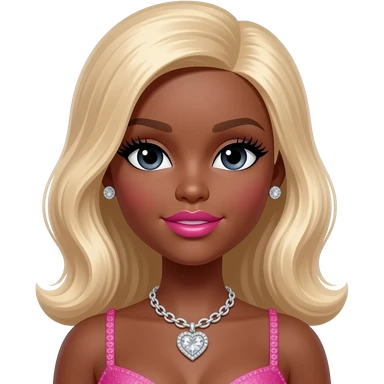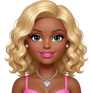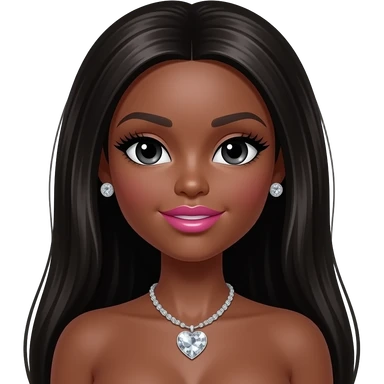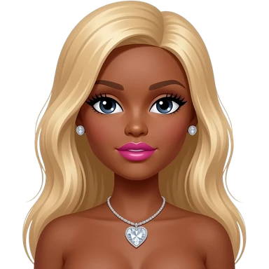 Black girl, Pink big lips, black doll eyes, dark brown skin, Long giant lashes,Doll faced shaped, silver Swarovski heart necklace, big diamond earrings studs, bimbo, black doll eyes, barbie, darker brown skin with long curly blonde hair, big breast, no bra emoji