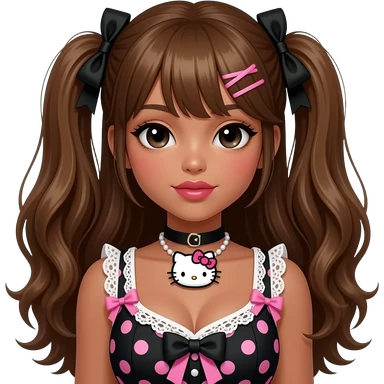 my melody hairclip, dark brown skin, Doll faced shaped, hello kitty necklace, bimbo, black doll eyes, Big lips, long honey brown hair, with white or black lace pink polka dots with gyaru sleeveless shirt, with hime gyaru bows, big breast emoji