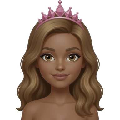 with pink tiara, Dark brown eyebrows,Dark brown skin, Doll shaped face, doll eyes, wavy with side part longer straightened honey brown hair, big breast no bra emoji