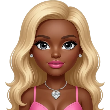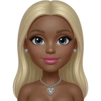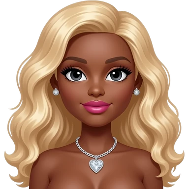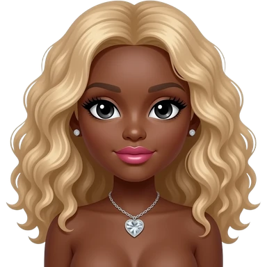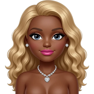 Black girl, Pink big lips, black doll eyes, dark brown skin, Long giant lashes,Doll faced shaped, silver Swarovski heart necklace, big diamond earrings studs, bimbo, black doll eyes, barbie, darker brown skin with blonde hair, big breast, no bra emoji