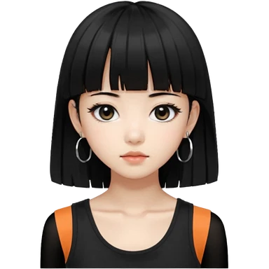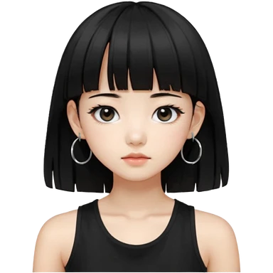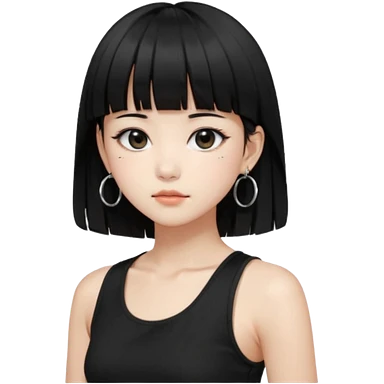 Korean girl, black tank top, black hair, black eyes, layered hair, cool girl, aesthetic, long hair, hime cut, blunt bangs, small silver hoop earrings emoji