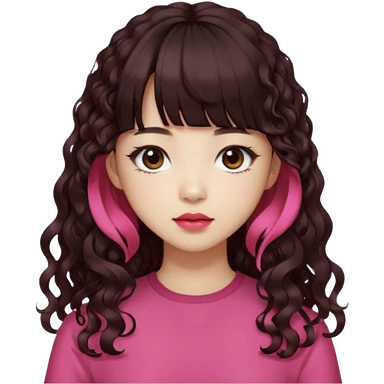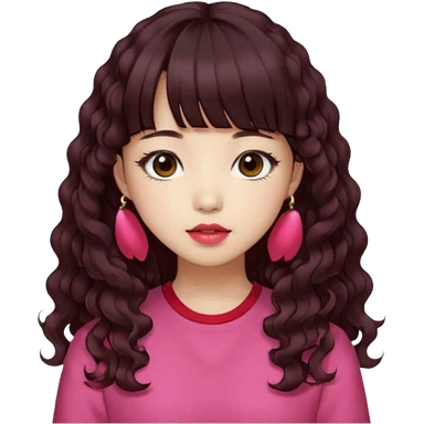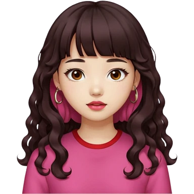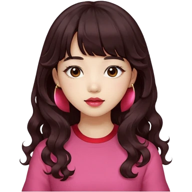 Korean girl, red top, black brown hair, brown eyes, long curly hair, aesthetic, long hair, hime cut, blunt bangs, pink lip, Cool girl emoji