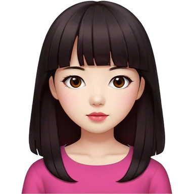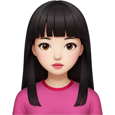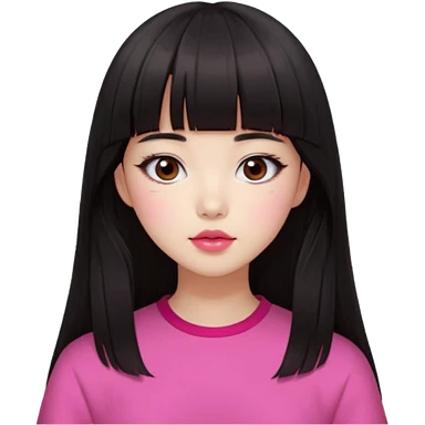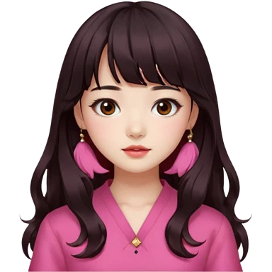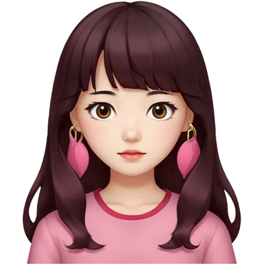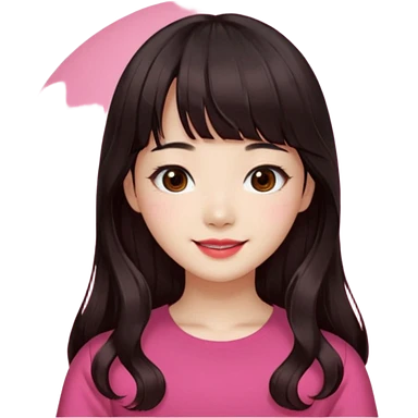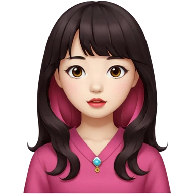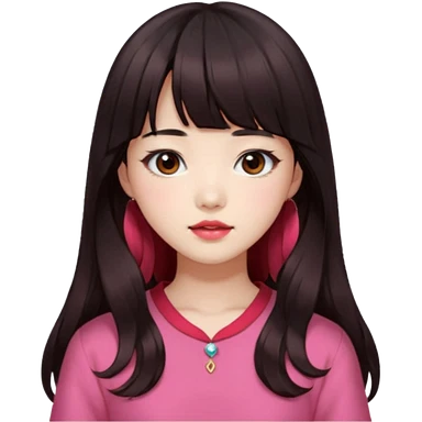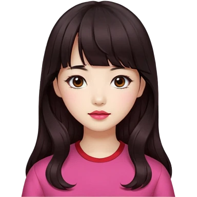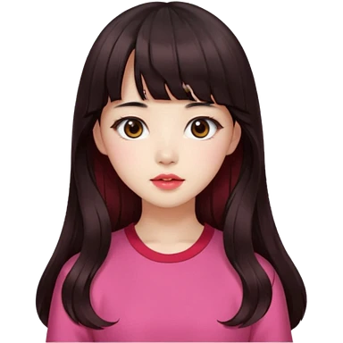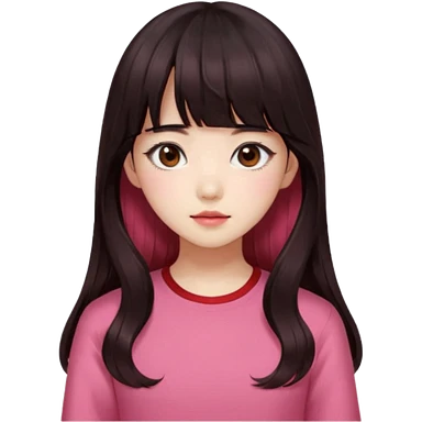 Korean girl, red top, black brown hair, brown eyes, long wavy hair, aesthetic, long hair, hime cut, blunt bangs, pink girl emoji