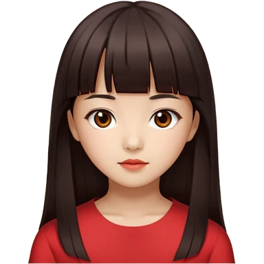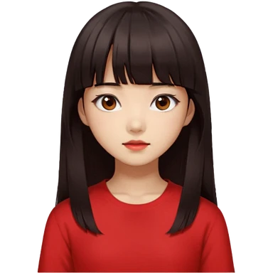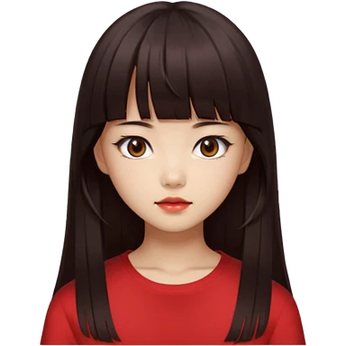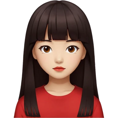 Korean girl, red top, black brown hair, brown eyes, long hair, cool girl, aesthetic, long hair, hime cut, blunt bangs emoji