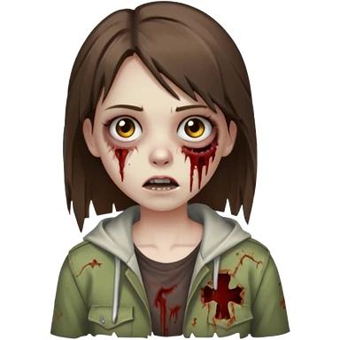 a zombie woman with straight brown long hair, a bruised mouth, and a smile emoji