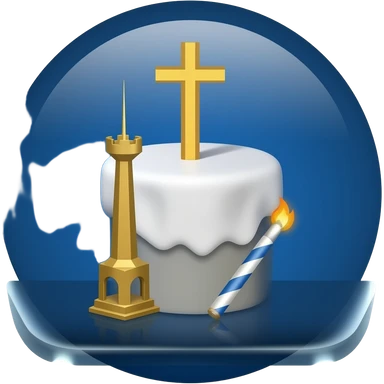 Dunkelblauer Hintergrund mit einer weissen Form in der Mitte, darauf ein goldenes Kreuz. Daneben eine lange goldene Säule wie ein dünner Turm. Ein gebogener Stab mit einer runden Spitze und ein kleines Flammensymbol. Alle Symbole liegen übereinander in der Mitte. emoji