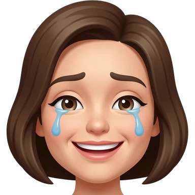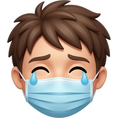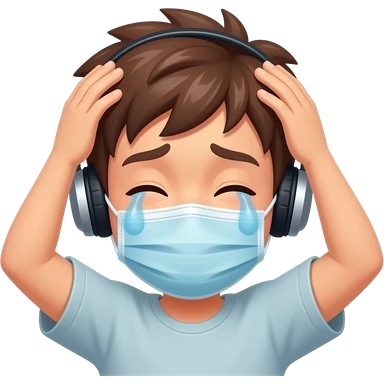 crying face with a smile and with brown messy hair and a mask and some head phones and hands on his head emoji