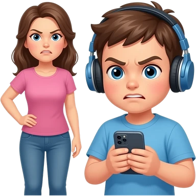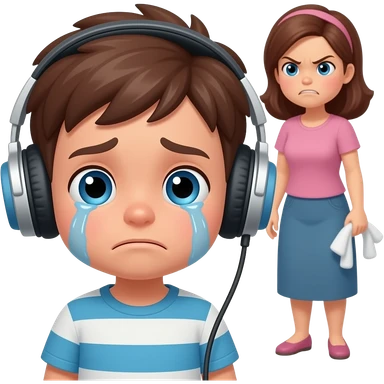 and then add a mom in the background and then make the boy cry and add head phones and also make the mom look like she is getting mad at him for not doing chores emoji