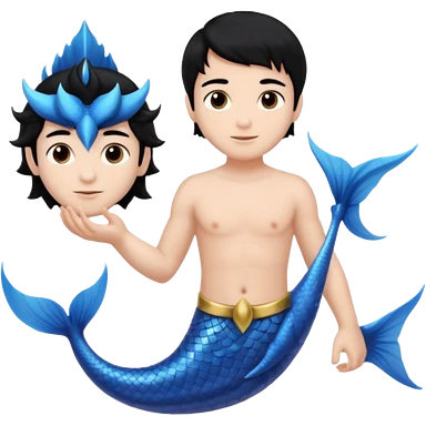 boy, black hair, brown eyes, white skin, Triton, with Triton in hand, blue Triton tail and blue triton ears emoji