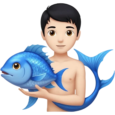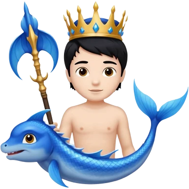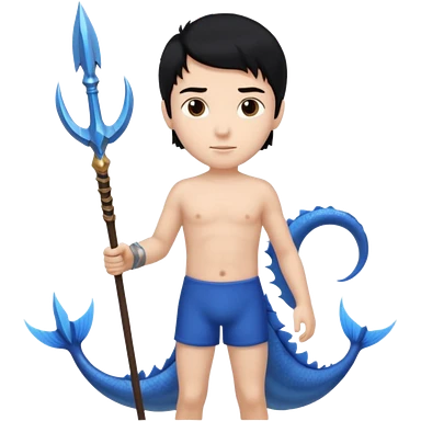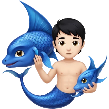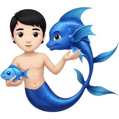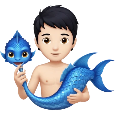 boy, black hair, brown eyes, white skin, Triton, with Triton in hand and blue Triton tail on the side. emoji