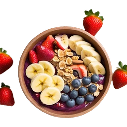 acai bowl in a wood bowl with bananas nutella strawberries granola honey and coconut flakes emoji