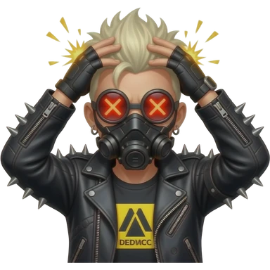 Character with black tactical face mask, LED circle eyes showing X X glowing red, spiked punk jacket, bleached blonde messy hair, DedSec yellow patch — hands gripping head, sparks flying, glitch scanline background. Flat sticker style, red neon outlines. emoji