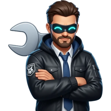 Wrench from Watch Dogs 2, LED mask eyes showing happy squint ˘ω˘ glowing cyan, chill pose, arms crossed, DedSec jacket. Flat sticker, dark background, neon outlines. emoji