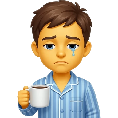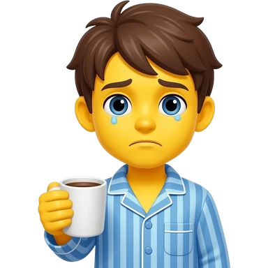 Hazme una un emoji de un chico con expresión cansada con piel amarilla cansado y tomándose un café que el café esté en la mano y que tenga una ropa de dormir con botones y que tenga el pelo café emoji