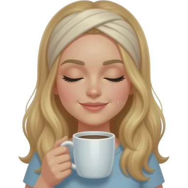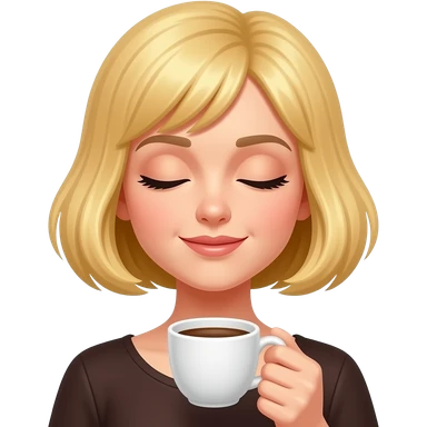Hazme un emoji de una mujer con colochos rubia tomándose un café caliente con expresión tranquila y que agarre el café con una sola mano y que tenga los ojos relajados y cerrados. emoji