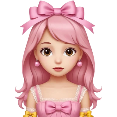 A teenage cute girl with very light olive skin and soft pinkish cheeks. Large bambie dark hazel eyes. Long wavy light brown hair with soft bangs. Features are very feminine and beautiful. medium straight nose with a soft tip. Medium natural pink lips. Wearing a simple dress in pink and white. emoji