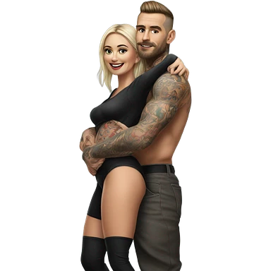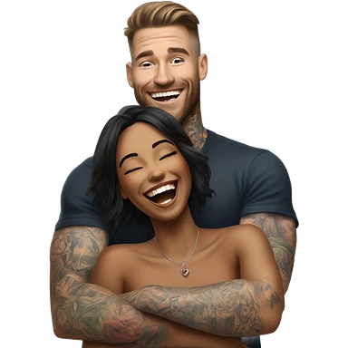 Hyper Realistic beautiful woman in the arms of a very handsome tattooed man laughing emoji
