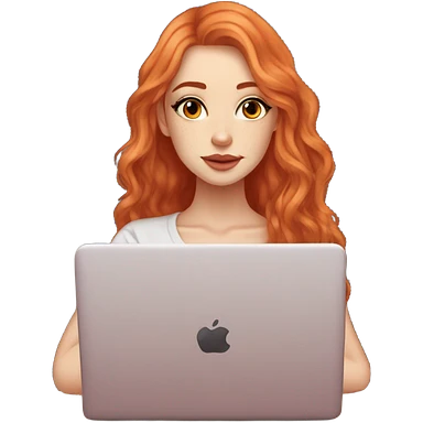 Long wavy red orange hair orange brown eyes beautiful face thick eyelashes pink lips gorgeous skinny fair skin white aesthetic tall girl working on laptop cozy emoji