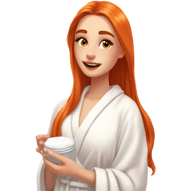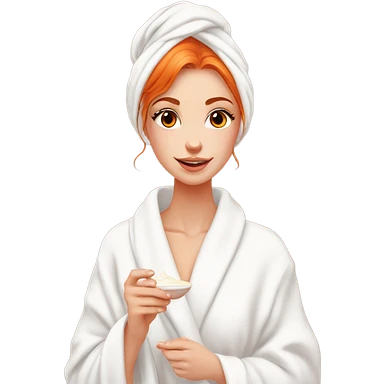 Girl putting cream on face bathroom red orange hair orange brown eyes beautiful face thick eyelashes pink lips gorgeous skinny fair skin white aesthetic tall girl doing skincare cozy robe hair in white towel emoji