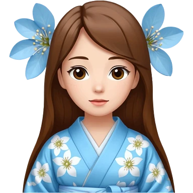 A woman with long brown hair is wearing a light blue kimono with white cherry blossom patterns. emoji