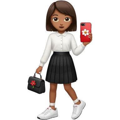 Menina pele parda, cabelo liso médio curto, roupa modesta, blusa branca e saia preta plissada, tênis branco celular Samsung a06 capinha vermelha, prendendor de cabelo de flor branca emoji