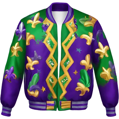 Lettermen jacket in purple, gold and green with the words “Mardi Gras” on the back emoji