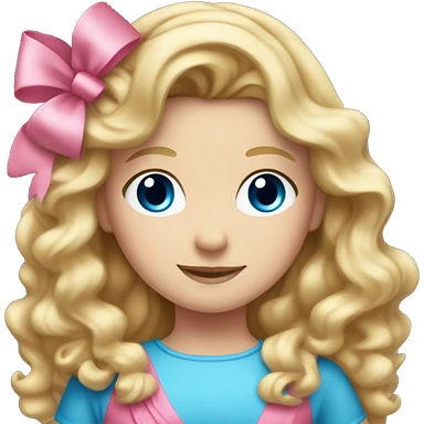 A 11 year old white girl with long wavy blonde hair and blue eyes with a pink bow in her hair wearing a pink dress emoji