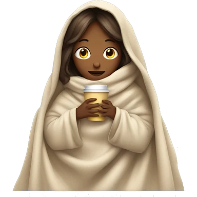 A beautiful girl with brown hair cozy with a nude blanket and a cup of coffee emoji