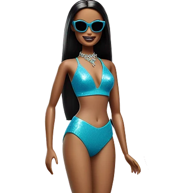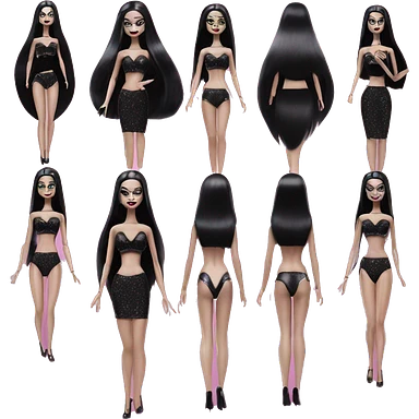 Teen Morticia Addams. Short Gothic bikini glitter Barbie emoji