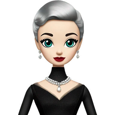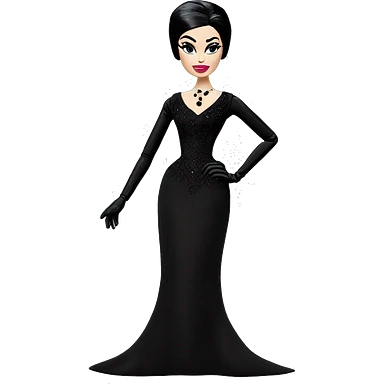Audrey Hepburn as Sabrina Barbie.Morticia Addams. Show full body. Embroidered long black gown with accessories jewelry and gloves emoji