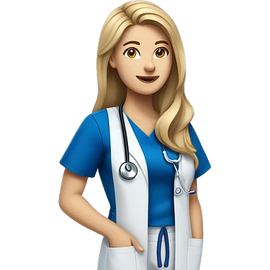 white female nursing school student with long dirty blonde hair in royal blue scrub top and royal blue scrub pants with a stethoscope around her neck emoji