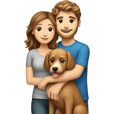 A caucasian brown haired boy hugging his caucasian brown haired girlfriend and holding a tan doodle dog emoji