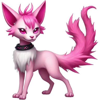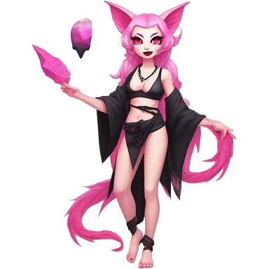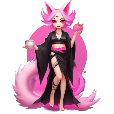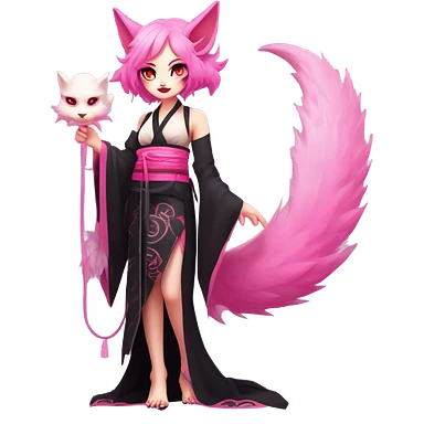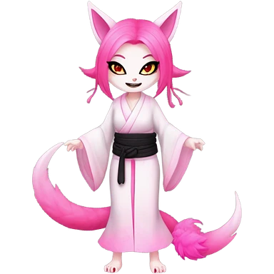 gender: female, succubus kitsune, neon pink eyes, vibrant pink hair, alabaster skin, voluptuous, athletic, fluffy black tails, pink tail tips, spiked choker, unique heritage, seductive charm, rebellious spirit, traditional kimonos, full body view emoji