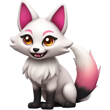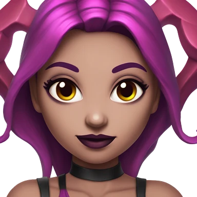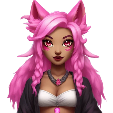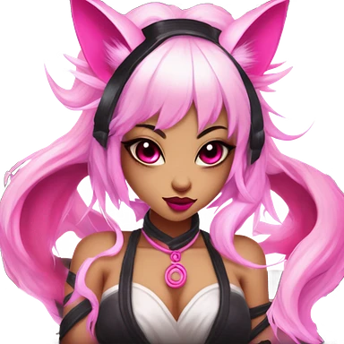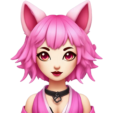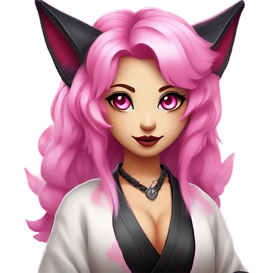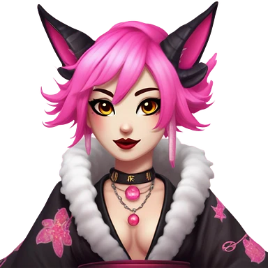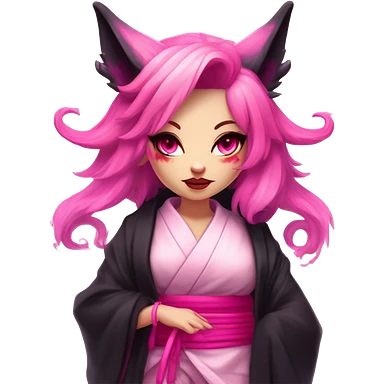 female, succubus kitsune, neon pink eyes, vibrant pink hair, alabaster skin, voluptuous, athletic, fluffy black tails, pink tail tips, spiked choker, unique heritage, seductive charm, rebellious spirit, traditional kimonos, full body emoji