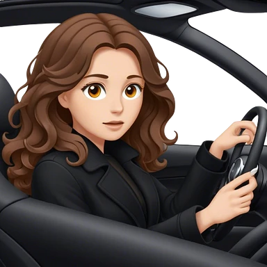 A thin white woman with long wavy brown hair in a black coat with brown eyes while driving a car and wearing silver rings and looks beautiful focused emoji