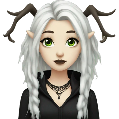 gothic girl, pale skin, green eyes, black dreads, bangs, black clothes, eyeliner, deer antlers emoji