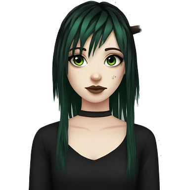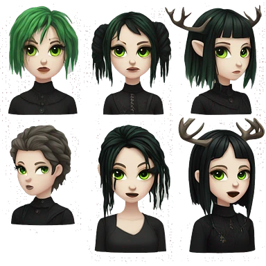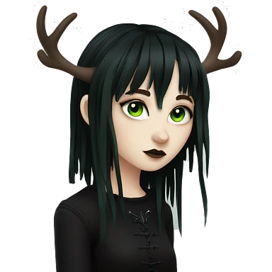 Emo girl, pale skin, green eyes, black dread-locks, bangs, black clothes, eyeliner, deer antlers emoji