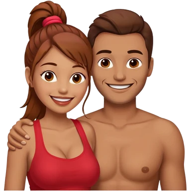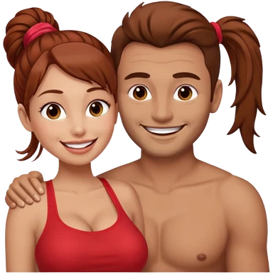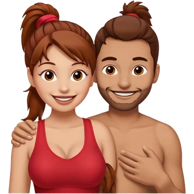 A red-skinned woman with really really big breasts, no clothes, brown ponytail hair, some guy's really long penis between her breasts, the girl and the guy are having sex, the girl is giving him a boobjob, we see her from the guy's point of view, the girl is having too much pleasure and an orgasm emoji