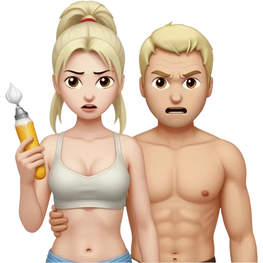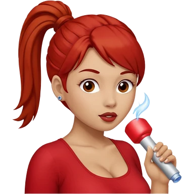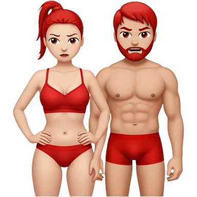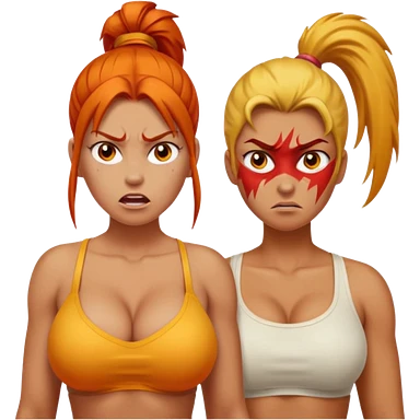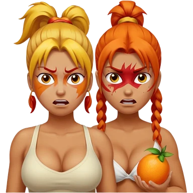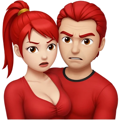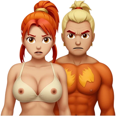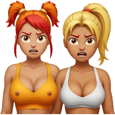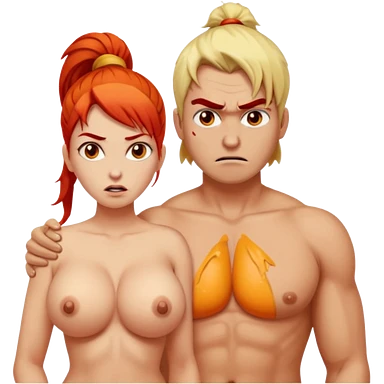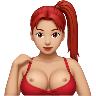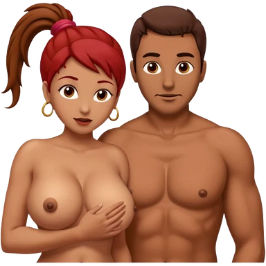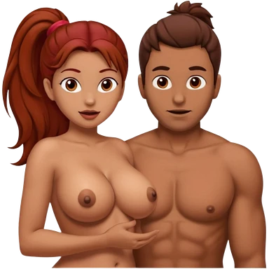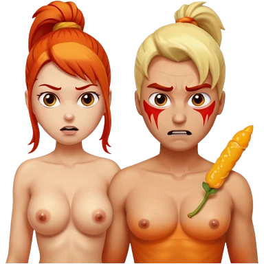 A yellow-orange-red angry woman with really really big breasts, no clothes, ponytail hair, and some guy's really long penus between her breasts with some white cream on top of it emoji