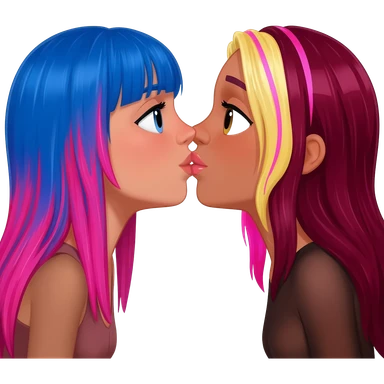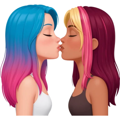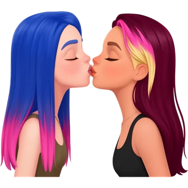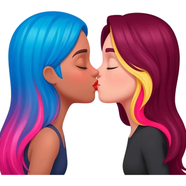 femme lesbians kissing, one has long blue and pink hair, the other has long burgundy hair with streaks of blonde and pink at the front emoji