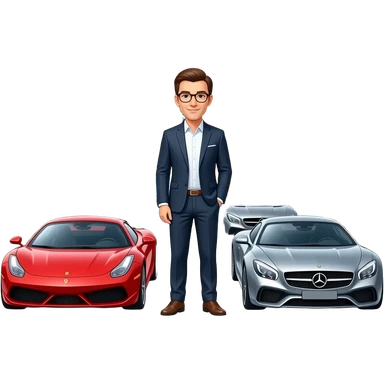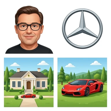 A Man Wearing Glasses With a Ferrari And Mercedes And Lamborghini With A Biggest Housek Like Building And 1000+ Cars There emoji